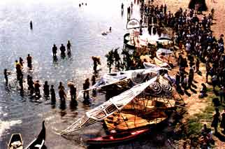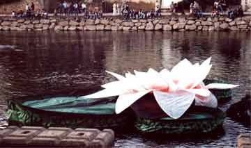 Durant ce parcours, lors des abordages sur les quais des villages, ces structures monumentales se détachaient de la base des radeaux et devenaient des personnages déambulatoires. En un point stratégique de la ville du Bugue, ils se réunissaient pour faire partager au public la Légende du Nénuphar.