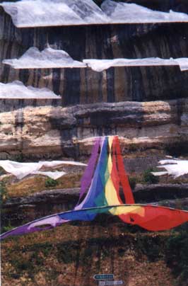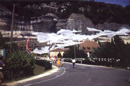 Décor de la "Félibrée", manifestation traditionnelle de la Dordogne, représentant une masse de nuages et un Arc-en-ciel qui descendait sur 100 m, du haut des falaises au centre des Eyzies.