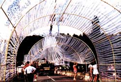 Ce décor réalisé par la Compagnie Tupi a été construit à partir d'arceaux de serre et habillé de bouteilles plastiques récupérées et mises en place par la population locale (6 000 bouteilles). |