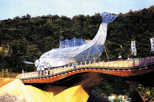Installée aux Eyzies sur un pont à l’entrée du village, ce poisson de 30 mètres de long et 10 mètres de haut a été conçu comme une porte permettant l’accès du public aux manifestations de “La Félibrée”. |